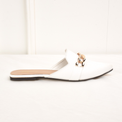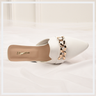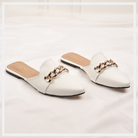 Flat mules like Sophia form a great addition to any closet. Exuding elegance with the metallic chain link detailing, these shoes come with a slip-on style to ensure a secure yet comfortable fit. Completed with a sharp pointed toe and chic squared-off vamp for a cool contrast. This pair can be teamed with slim jeans and an in-season top when you're going to a celebration.