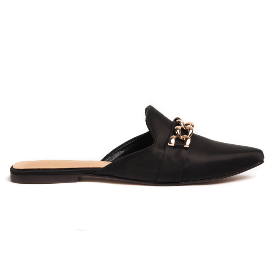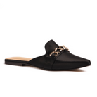Flat mules like Sophia form a great addition to any closet. Exuding elegance with the metallic chain link detailing, these shoes come with a slip-on style to ensure a secure yet comfortable fit. Completed with a sharp pointed toe and chic squared-off vamp for a cool contrast. This pair can be teamed with slim jeans and an in-season top when you're going to a celebration.