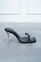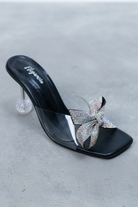 Inject a touch of decadence to your evenings with these transparent square toe heels. Featuring comfortable sole with bow shaped embellishment with rhinestones adding futuristic glam to your shoe-dobe.