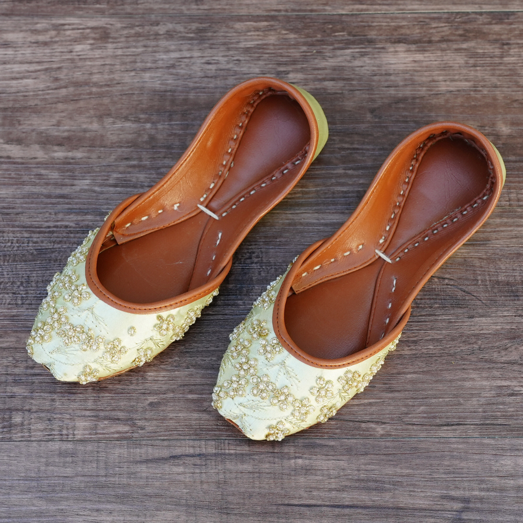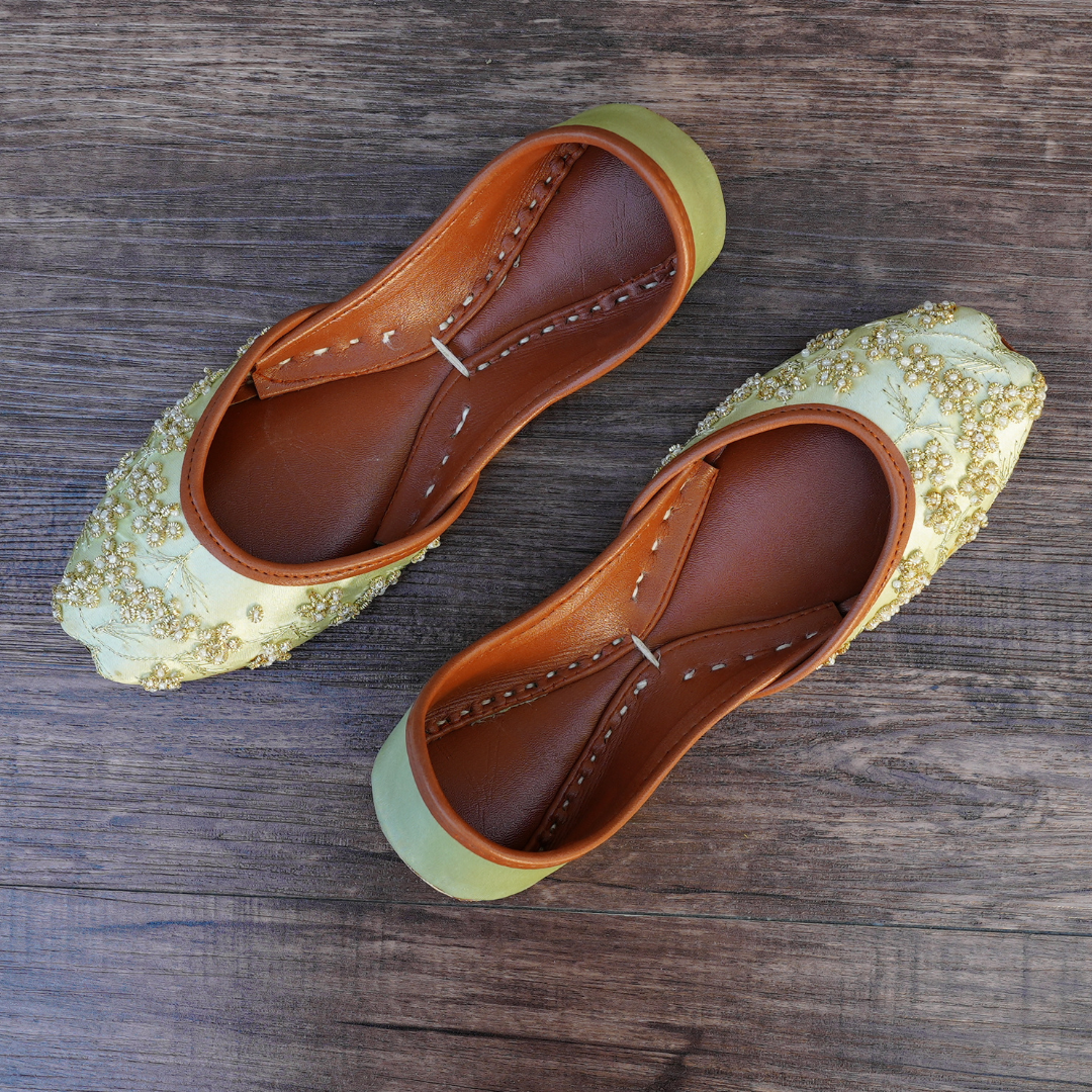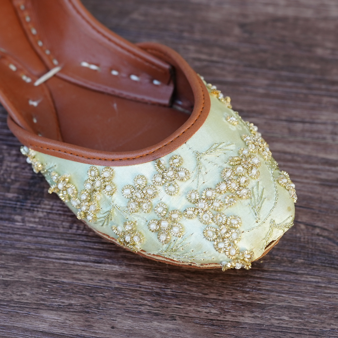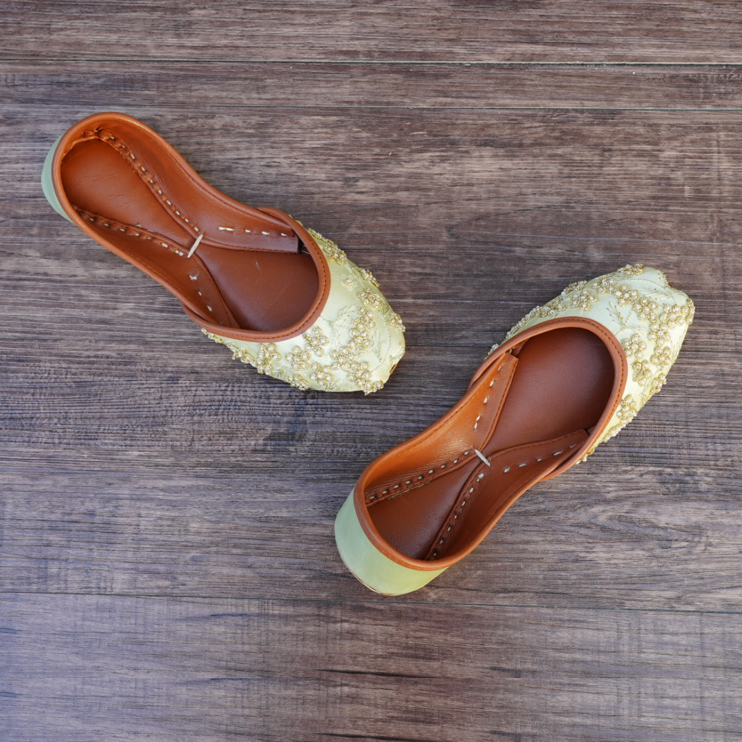 The minimal design of this pair makes it stand out. The beautiful khussa is embellished with cutdaana and dubka; the heavy detailed work is going to be an eye candy that fits every festive outfit. Elegancia offers you a blend of style, comfort and ethnicity, everything you need at one place.Â