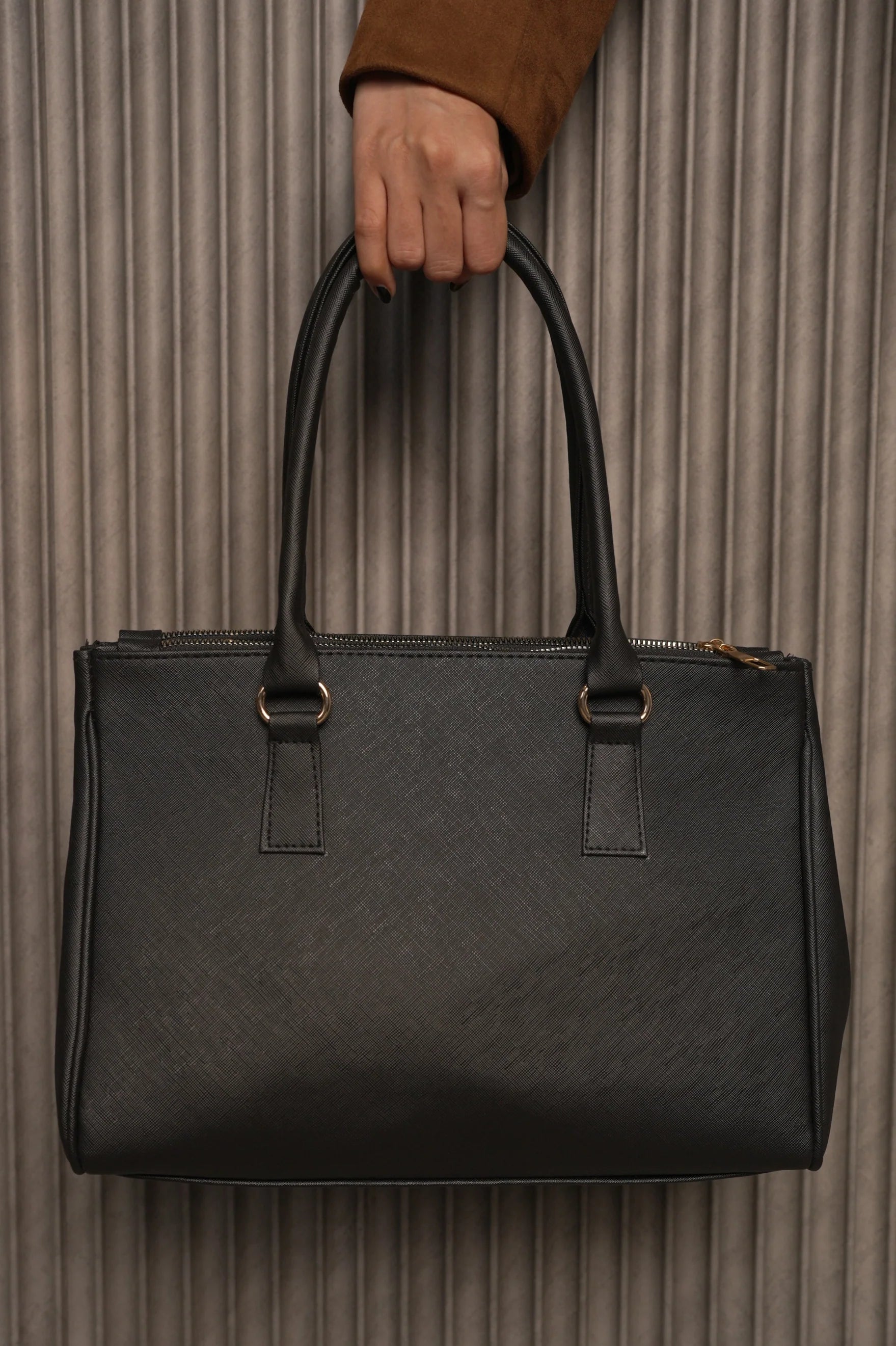 Elevate your everyday style with this sophisticated black handbag, crafted from a luxurious blend of smooth faux leather and soft suede. Designed with a structured silhouette, it offers both elegance and practicality for the modern woman on the go. The gold-tone hardware adds a touch of refinement, while the spacious interior ensures ample room for all your essentials.