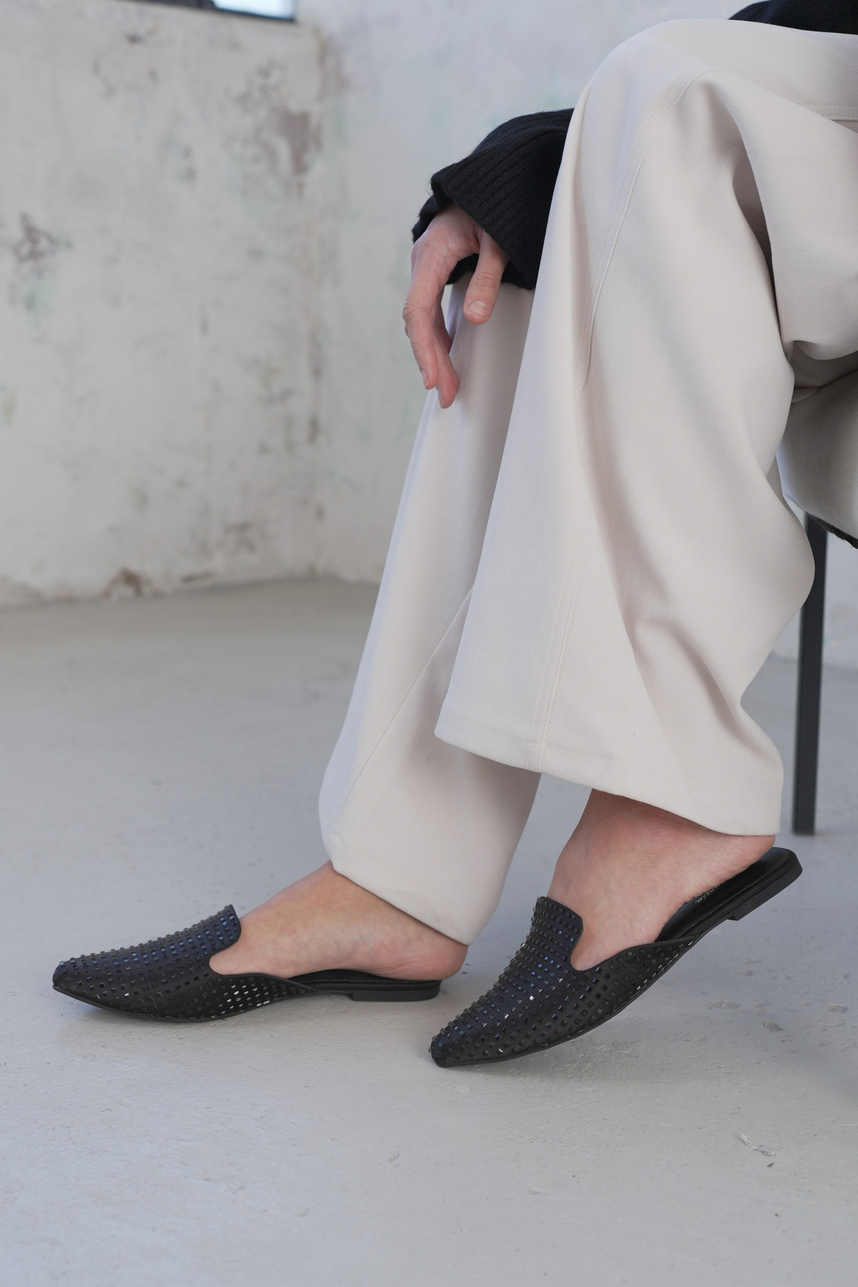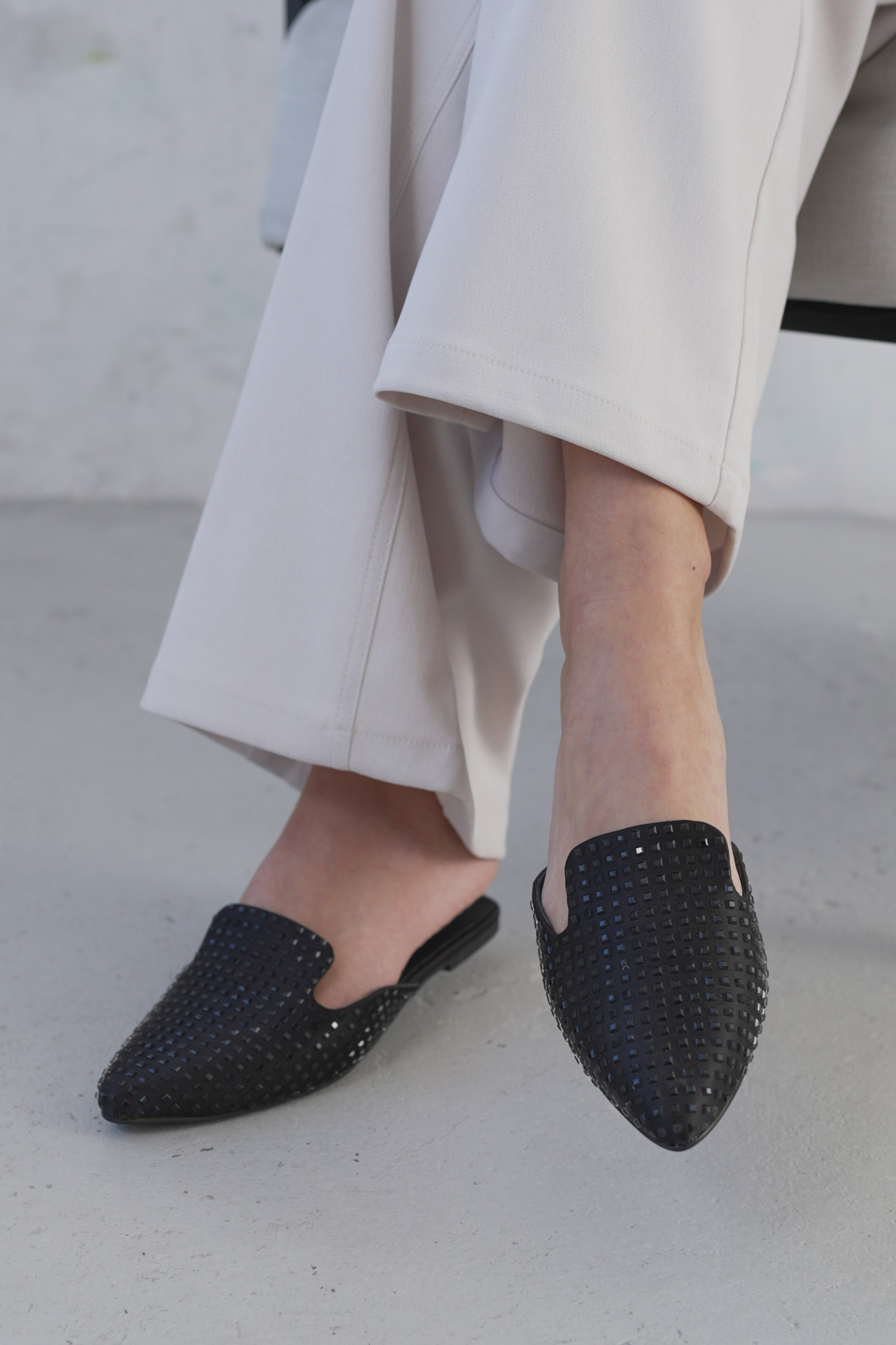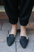 Elevate your everyday ensemble with these chic, ORNATE slip-on mules. Featuring a sleek pointed-toe silhouette and a subtle tone-on-tone stud embellishment, these flats offer a modern twist on the classic loafer. Perfect for transitioning from the office to dinner, they provide effortless elegance without sacrificing comfort.