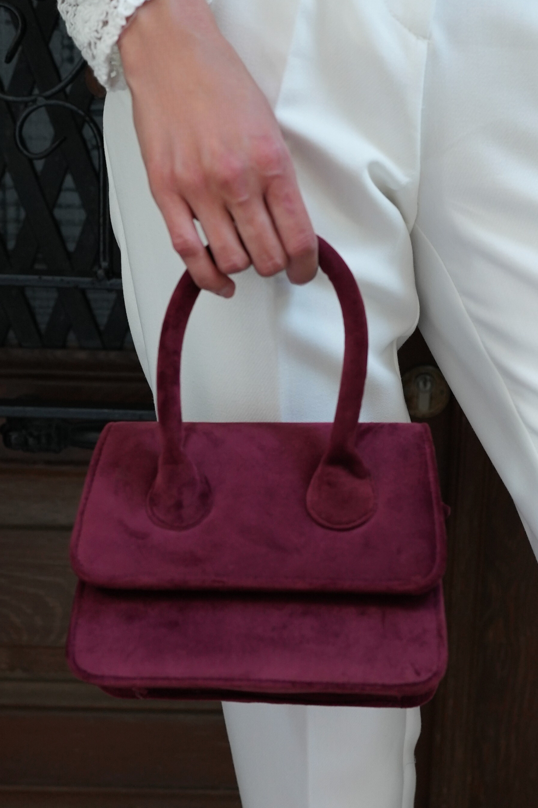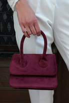 Elevate your accessory game with this rich velvet handbag, blending vintage elegance with modern minimalism. Crafted from premium-quality suede in a deep maroon hue, this structured silhouette features: