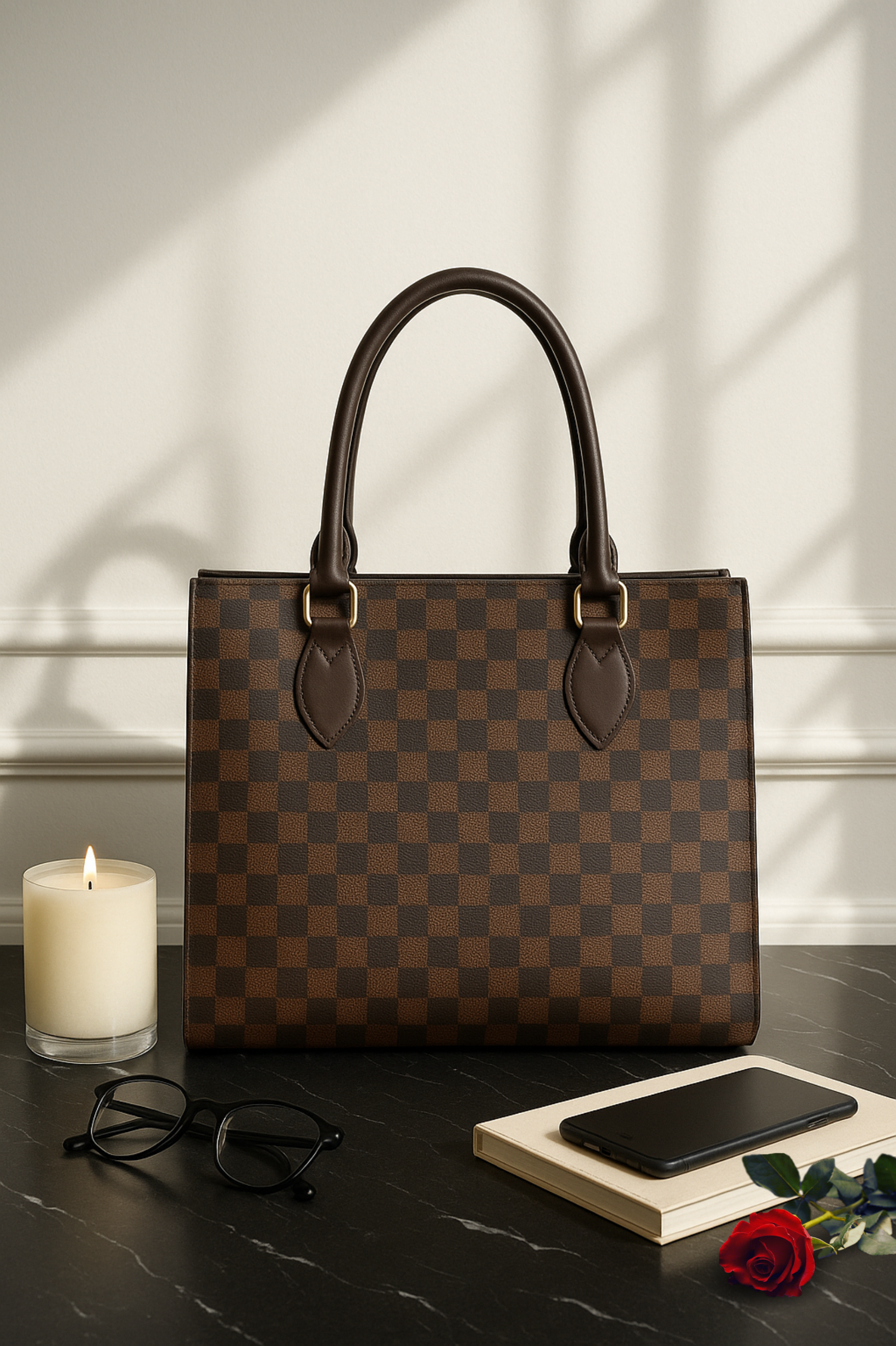 Elevate your everyday style with our Classic Checkered Tote Bag, crafted for the modern trendsetter. Featuring a timeless checkered pattern in rich brown tones and durable vegan leather accents, this tote blends sophistication with functionality. Its spacious interior is perfect for carrying daily essentials, from your tablet and wallet to beauty accessories and more.