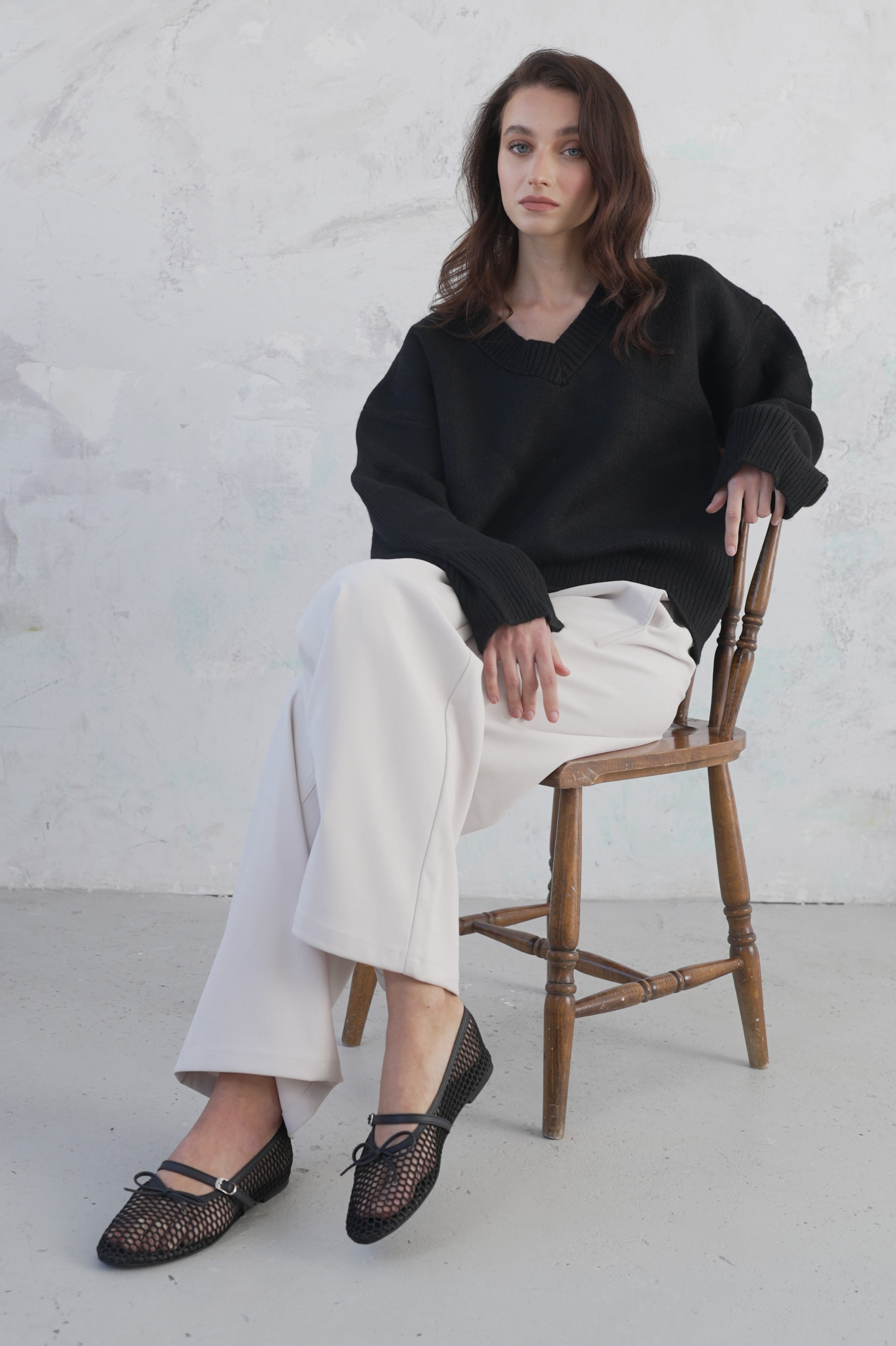 For an Elevated Look: Style them with a midi skirt, a tailored dress, or wide-leg trousers (as pictured) for a sophisticated look appropriate for the office or an evening out.