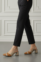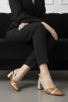 Discover the perfect blend of modern design and timeless sophistication with these exquisite slingback pumps. Crafted with a premium faux leather finish, this shoe features an artful, two-tone palette combining a soft, creamy fawn with a rich, warm caramel tan. The elegant pointed-toe silhouette is enhanced by a distinctive caramel cap-toe and a chic crisscross strap detail across the vamp. Resting on a contemporary, sculpted block heel of a comfortable mid-height, these pumps offer both style and stability. The design is completed with an adjustable slingback strap, ensuring a secure and polished fit for any occasion.