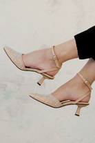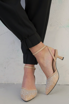 SAPPHIRE striking black slingback pumps feature a sophisticated pointed toe completely covered in brilliant, scattered rhinestones for maximum sparkle. The comfortable kitten heel and delicate, adjustable ankle strap ensure a secure fit and elegant silhouette, making them the perfect choice for any occasion requiring a touch of glamorous sophistication.