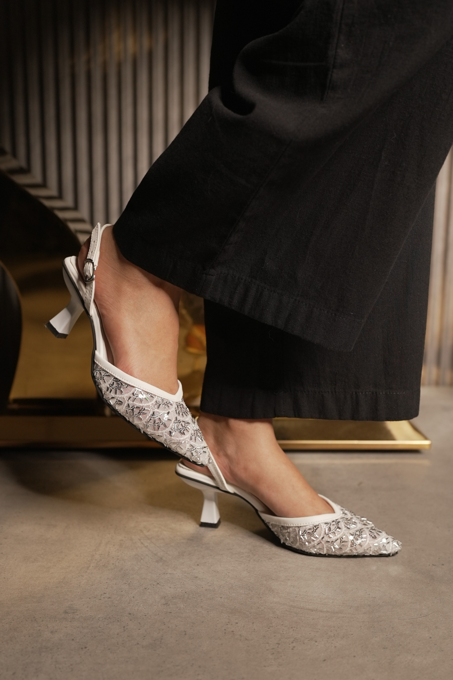 • Material: Sheer or mesh textile upper (with embroidery/sequins).