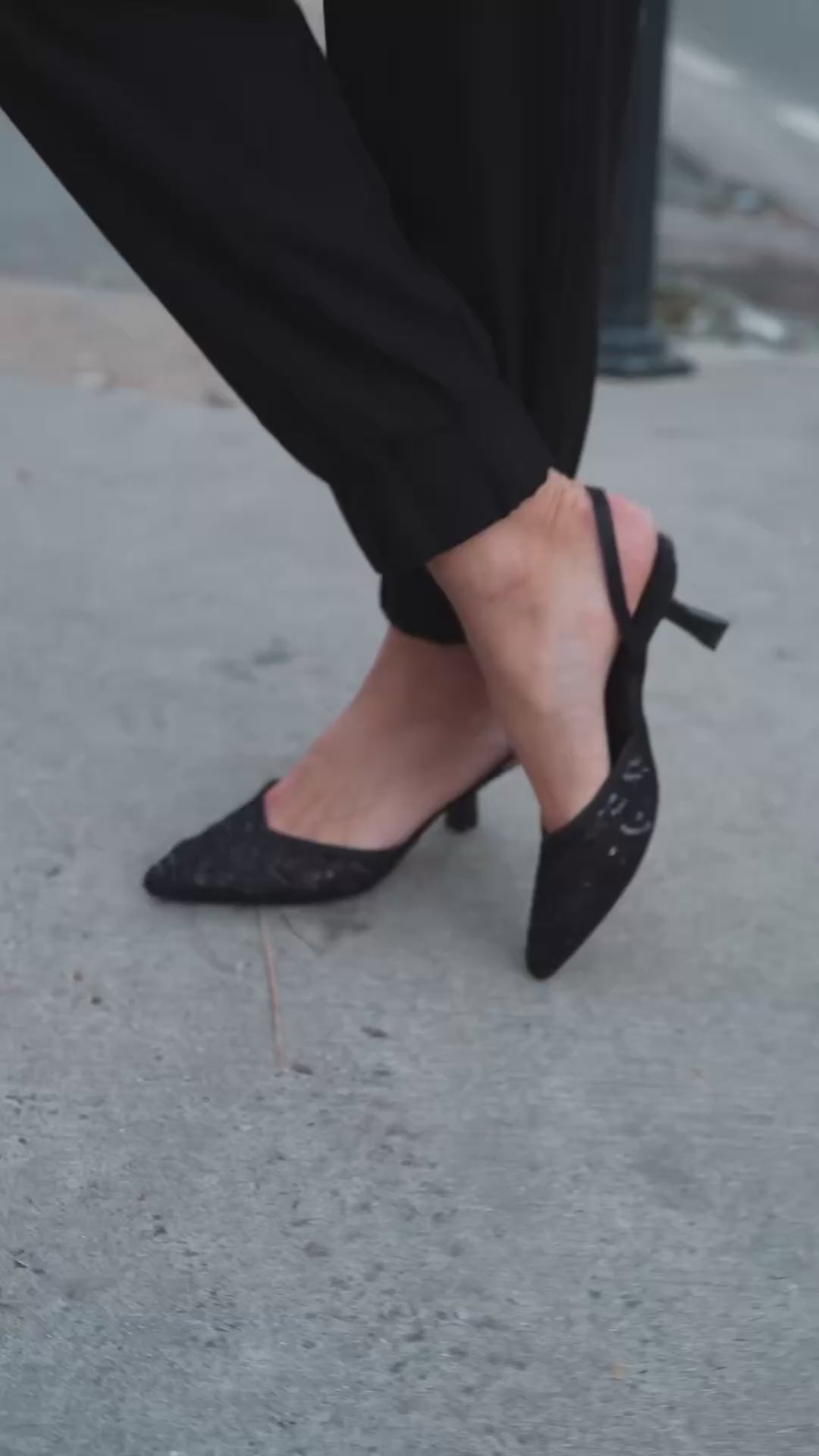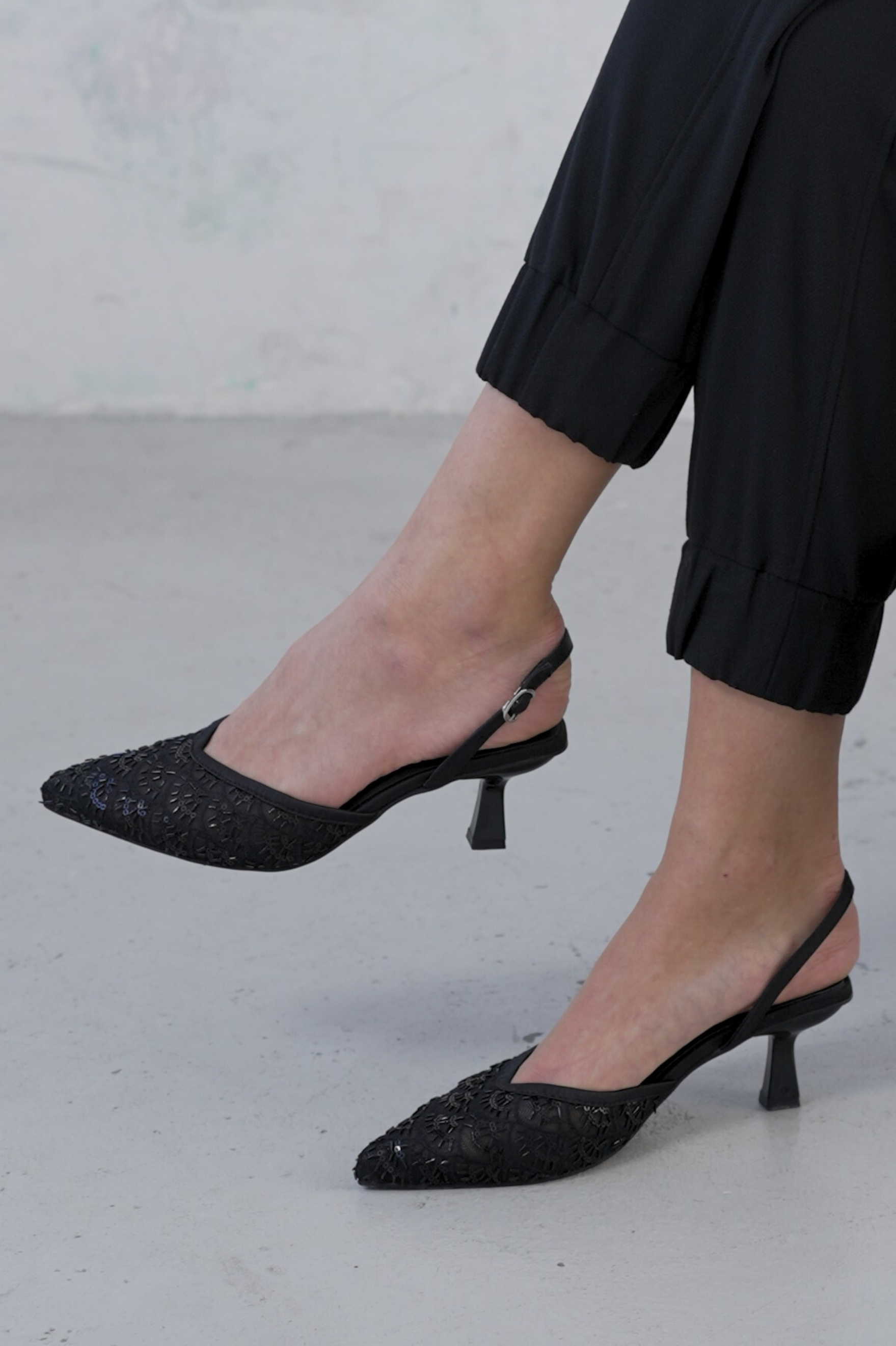These elegant ANGELINA pumps are a sophisticated choice for any dress occasion. The design features a classic pointed toe and an adjustable slingback strap for a secure fit. The upper is crafted from a sheer, delicate fabric, beautifully adorned with intricate tone-on-tone black embroidery and subtle sequin accents that catch the light. The shoe is balanced on a stylish, low sculptural kitten heel, providing a comfortable lift and a modern silhouette. They offer a refined touch of texture and sparkle, making them a perfect, understated statement shoe.