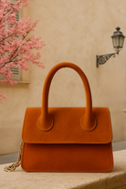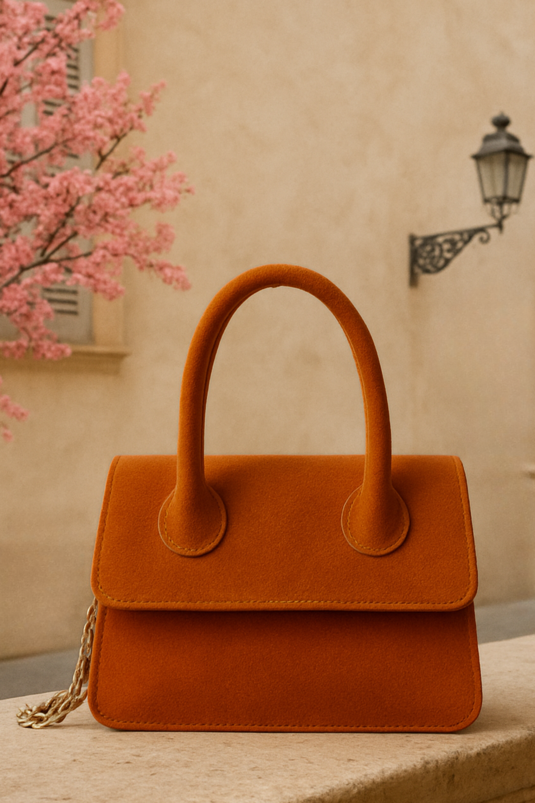 Elevate your accessory game with this rich velvet handbag, blending vintage elegance with modern minimalism. Crafted from premium-quality suede in a deep rust hue, this structured silhouette features: