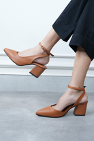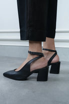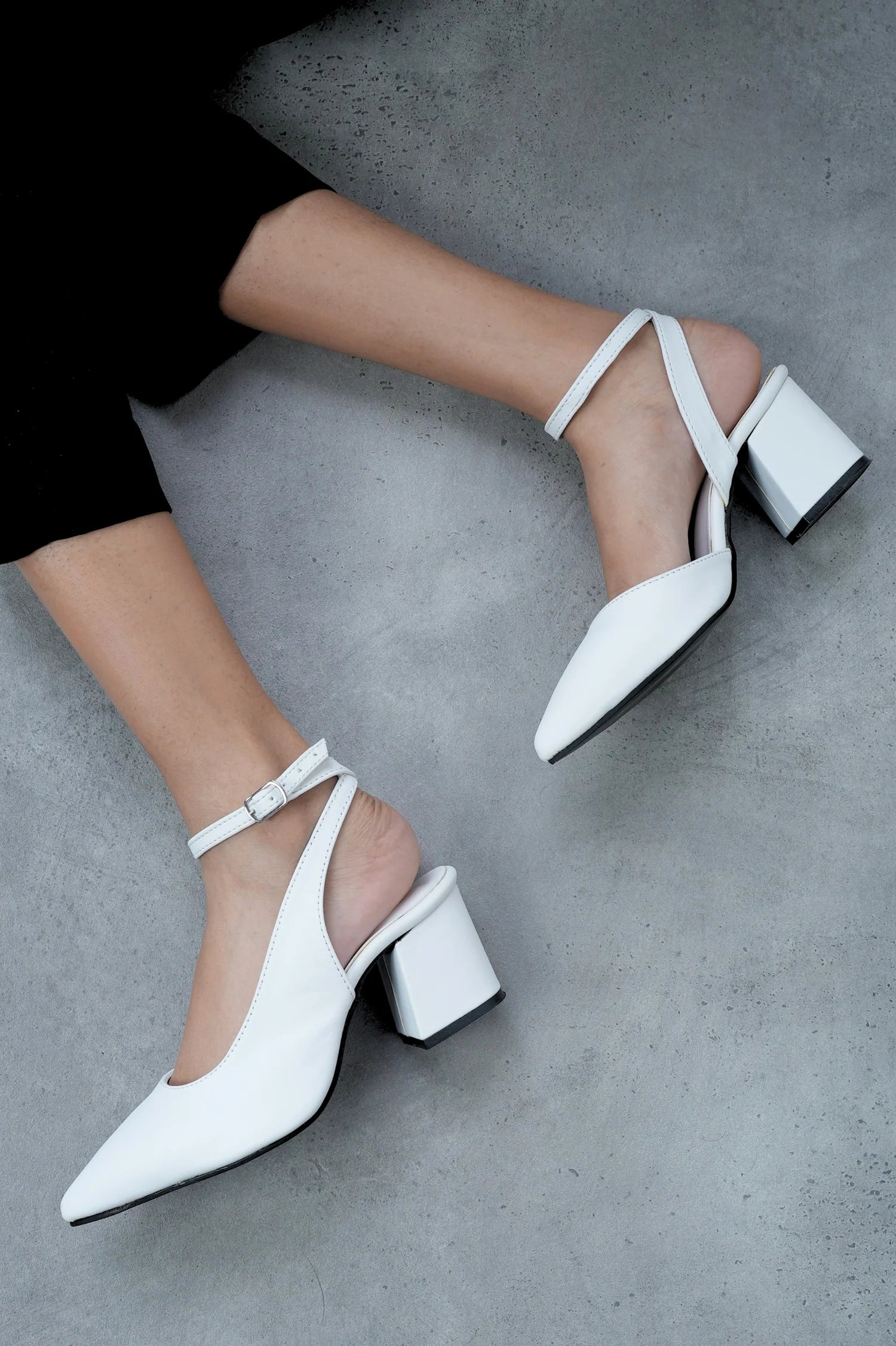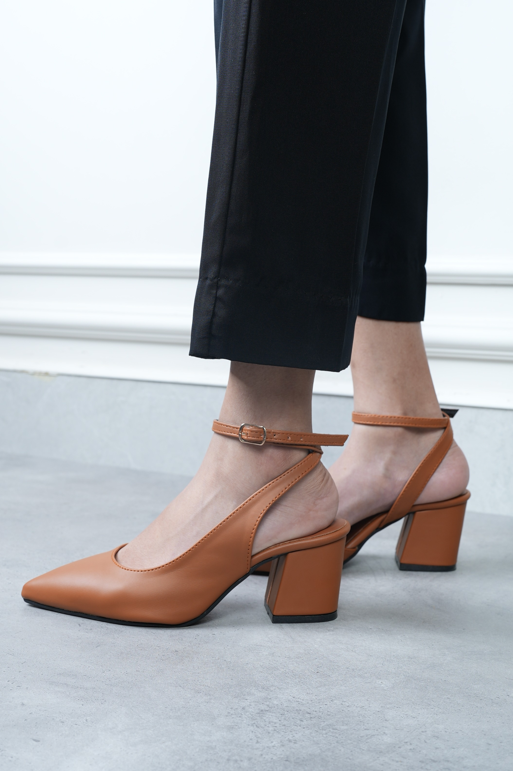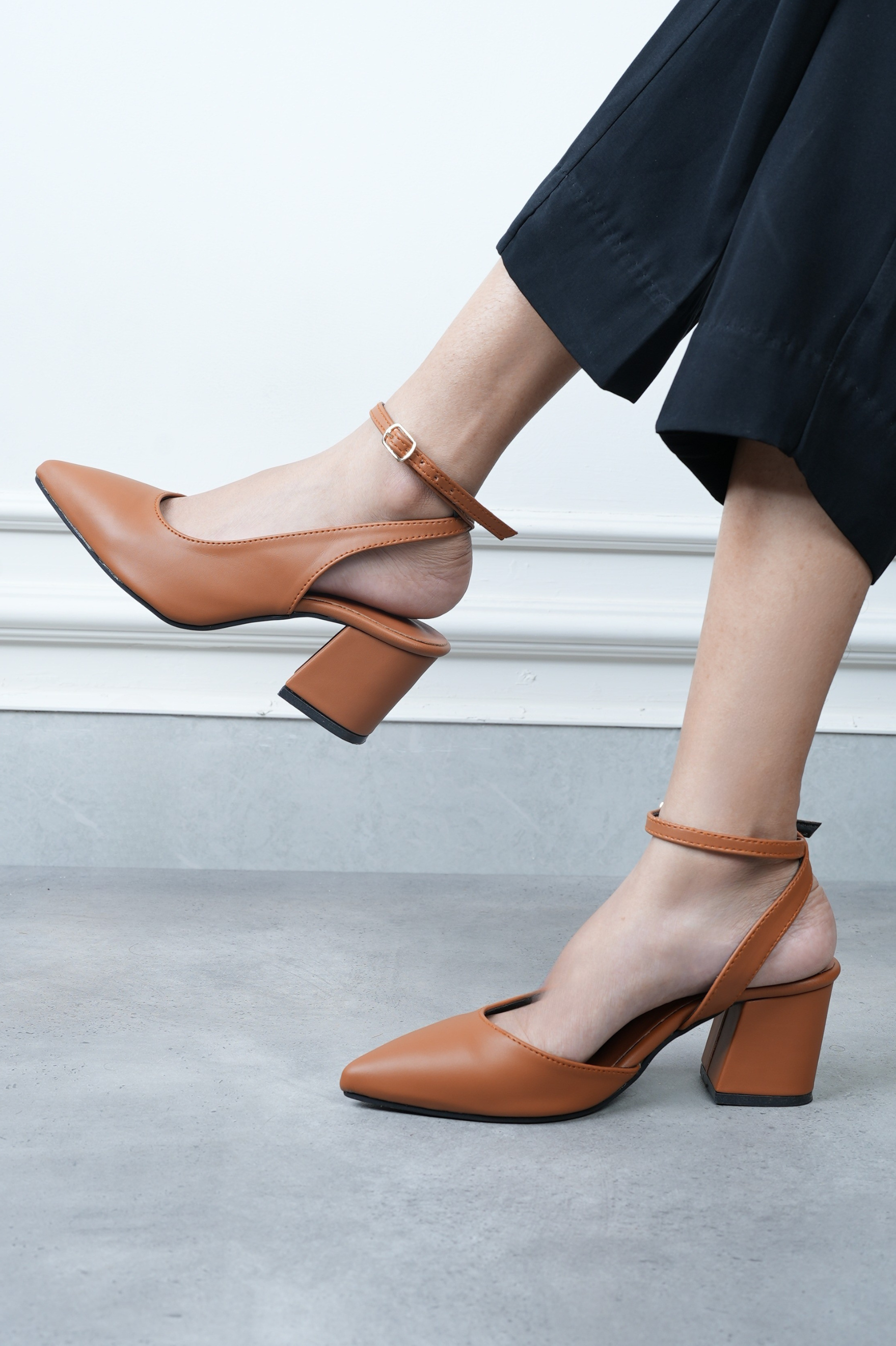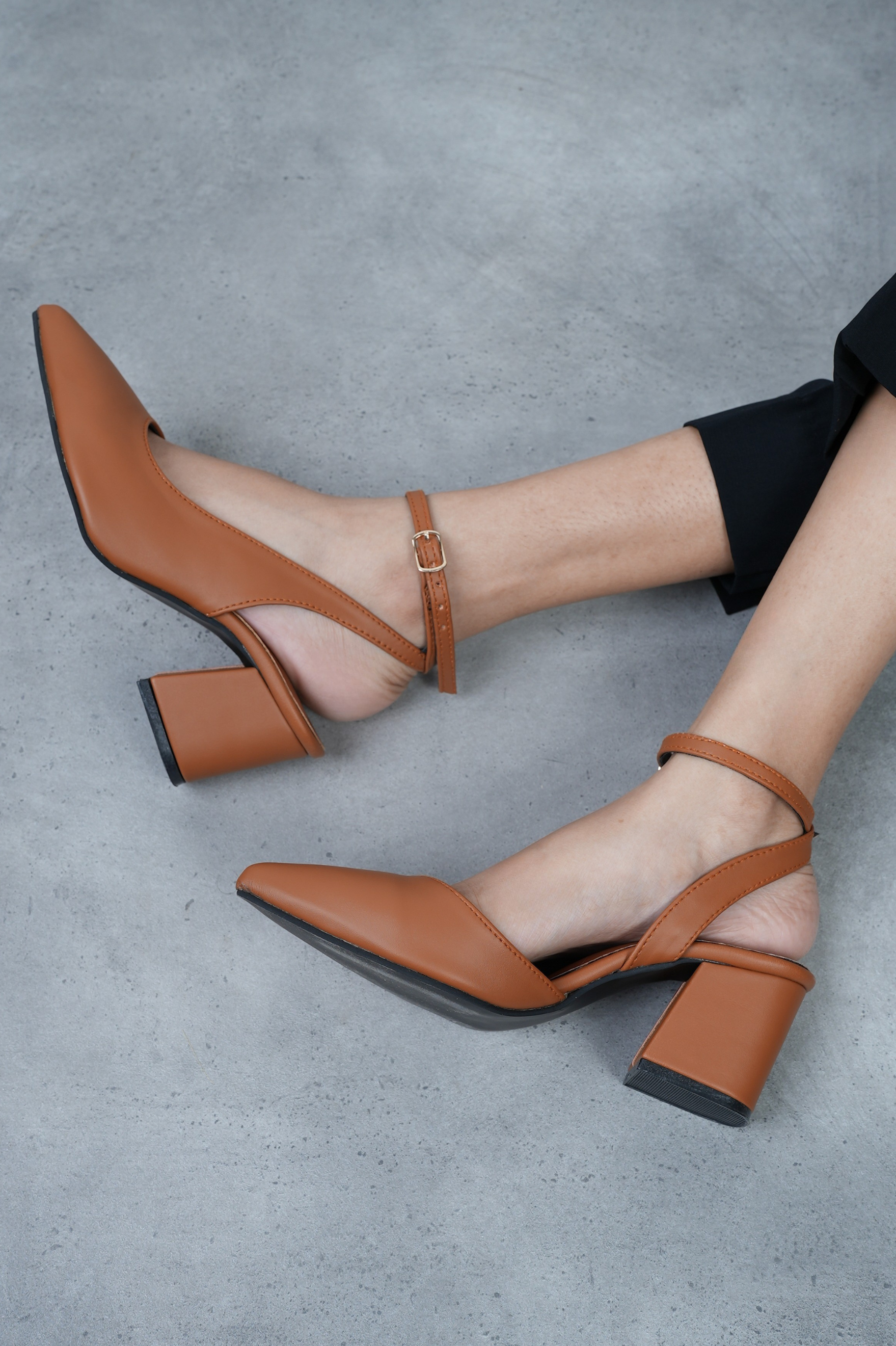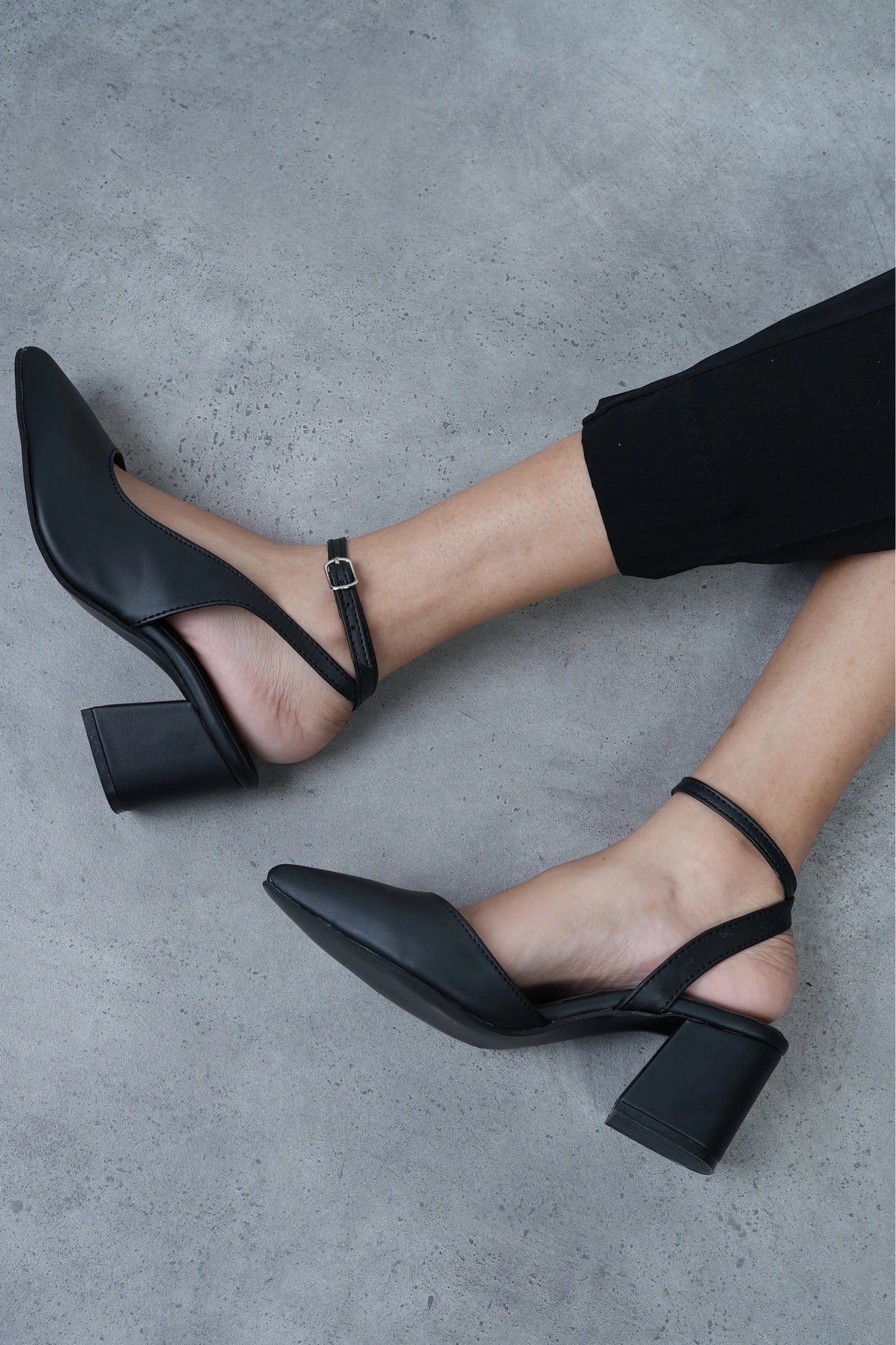 A pair of versatile and stylish faux leather pumps that offer both comfort and sophistication. These shoes feature a classic pointed-toe design and a distinctive, chunky geometric block heel that provides stability and a modern touch. The ankle strap, secured with a simple gold buckle, ensures a secure and adjustable fit while adding a refined detail. The cut-out sides give them a d'Orsay style, revealing the arch of the foot for an elegant silhouette.