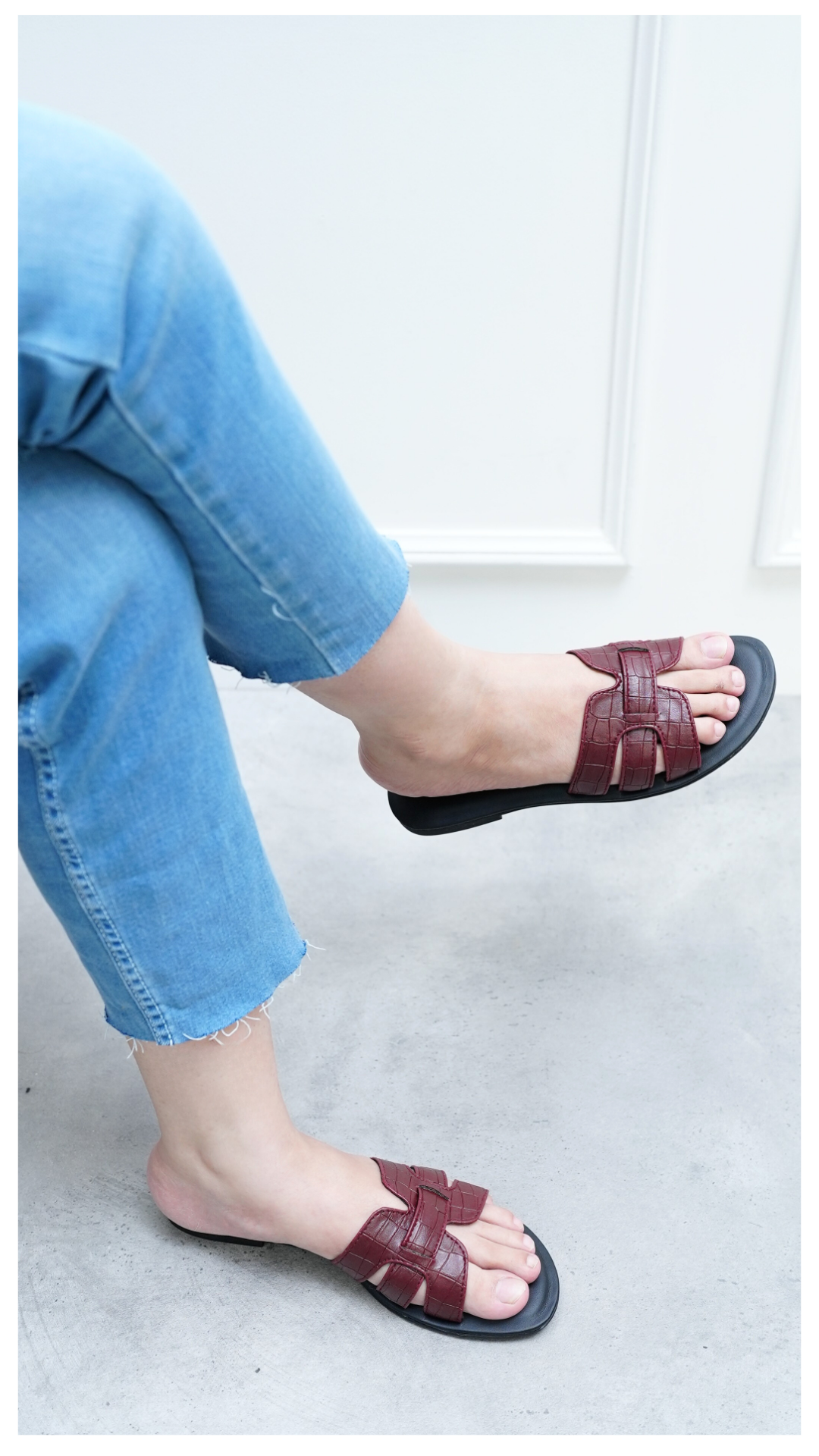 The solid-colored crocodile print slide features a square toe all the while gripping your feet in a comfortable hold of the trendy H-shaped vamp band, supported by the uniquely designed soles to ensure the utmost care to your feet.
